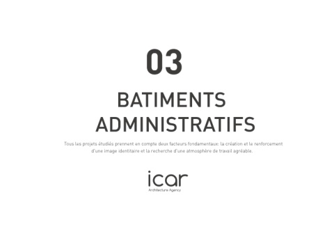 03 BATIMENTS ADMINISTRATIFS Tous les projets étudiés prennent en compte deux facteurs fondamentaux: la création et le renforcement d'une image identitaire et la recherche d'une atmosphère de travail agréable.