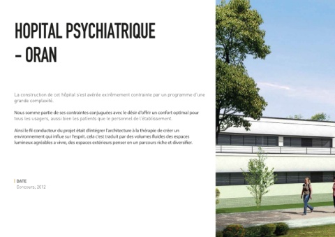 HOPITAL PSYCHIATRIQUE - ORAN La construction de cet hôpital s’est avérée extrêmement contrainte par un programme d’une grande complexité. tous les usagers, aussi bien les patients que le personnel de l’établissement. DATE Concours; 2012